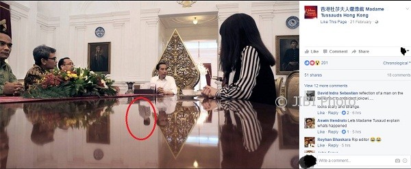 Solopos.com, JAKARTA – Patung lilin Presiden Joko Widodo (Jokowi) untuk Museum Madame Tussauds Hong Kong (MTHK) akan mulai dipajang kuartal kedua 2017. Alih-alih membicarakan tentang patung Jokowi, netizen malah sibuk mempertanyakan penampakan misterius yang muncul di foto Presiden Jokowi saat diskusi dengan tim MHTK.
