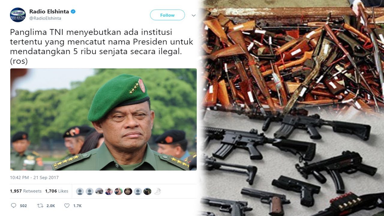 Dalam kicauan tertanggal 22 September 2019, Sabtu pukul 12.42 WIB, Twitter radio Elshinta mengungkapkan, Panglima TNI menyebut ada institusi tertentu yang mencatut nama Presiden untuk mendatangkan 5.000 senjata secara ilegal.