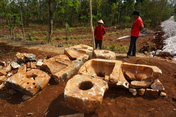 "Awalnya saat mengeruk tanah untuk jalan setapak warga dengan bachoe ditemukan batu ini yang bentuknya kotak dan lubang bulat ditengah. Sepertinya dua ini namun terpecah-pecah jadi enam bagian," katanya Rabu (8/8/2018).